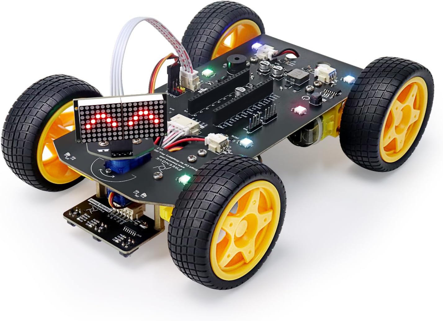 Important Notes: This car needs to be assembled and does NOT include battery. (Refer to "About_Battery.pdf" in downloaded file to buy battery.) Purchase Options: Raspberry Pi Pico W supports wireless LAN, Raspberry Pi Pico does not. This option includes the Raspberry Pi Pico W board. Can use phone, tablet and computer as controller. Overview: Raspberry Pi Pico W is a tiny, fast, and versatile board built using dual-core processor with wireless LAN. This kit shows you how to use it as a controller to build a car. We provide free technical support to help you with any questions and problems. Tutorial and Code: Comes with detailed tutorial and complete code. (Download needed, no paper tutorial.) The download link can be found on the product box. Control: You can use the following devices to control this car: For Pico W only: * Computer: Laptop or desktop. (Run Windows or macOS.) (Refer to tutorial for details.) * Android device: Android phone or tablet. (Run Android 4.4 or later, installed Freenove App.) (Search Freenove on Google Play.) * iPhone: (Run iOS 10 or later, installed Freenove App.) (Search Freenove on App Store.) Package Includes: 1 x Raspberry Pi Pico W 1 x Raspberry Pi Pico (W) Car Shield 1 set Machinery Parts (4 kinds) 1 x Servo Package 4 x Driven Wheel 4 x DC Speed Reduction Motor 4 x Motor Bracket Package 1 x Line Tracking Module 1 x Dot Matrix Module 1 x Ultrasonic Module 1 x Ultrasonic Module Connector 1 x XH-2.54-4Pin Cable 1 x XH-2.54-5Pin Cable 1 x Cross Screwdriver (3mm) 1 x Black Tape Needed but Not Included: 2 x Battery (Refer to "About_Battery.pdf" in downloaded file to buy.) 1 x Charger for battery