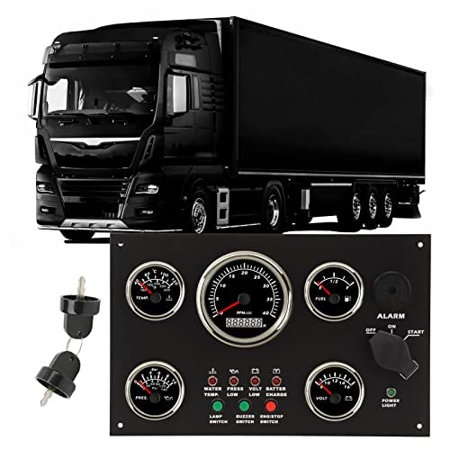 Specification: Item Type: Dash Instrument Panel Material: Aluminum alloy+ABS+stainless steel+tempered glass Function Display: 85mm tachometer can display: engine speed 0-4000RPM, 99999.9H timing 52mm water temperature gauge shows water temperature: 100-250℉ (40-120 ℃); (Input signal: 301-22ohms) The 52mm oil level gauge shows the oil volume of the oil tank: F-1/2-E; (Input signal: 0-190ohms) The 52mm oil pressure gauge can display the oil pressure of the oil tank: 0-10Bar (0-145psi); (Input signal: 10-184ohms) 52mm voltmeter can display battery voltage: 8-16V; Operation Mode: LCD display, stepper motor Working Voltage: DC12V circuit system; (Except for the voltmeter, the other four instruments can work in the DC24V circuit system) Working Current: ≤ 100 MA Working Temperature: - 30 ℃ -+75 ℃ Storage Temperature: - 40 ℃ -+85 ℃ Backlight Color: Red Protection Grade: IP67, can work at 1m underwater, excellent antifog function; Application: This instrument panel can be installed in the central control position of your RV yacht or engineering vehicle. It only needs 300 x 190mm / 11.8 x 7.5in unit area to combine the five instruments together, which greatly saves space and decorate your central control. The five instruments are equipped with red back light and red LED light needles, which can clearly view all parameters even at night. At the same time, the multifunction panel also includes water temperature alarm, low oil pressure alarm and low voltage alarm, The charging indicator, lighting switch, BUZZER switch, ENG STOP switch and other functions can be used to know the status of the engine at any time through the data on the panel Application: The central control multifunction refitting panel can be used in the fields of engine, generator set, RV, yacht, fishing boat, ship, engineering machinery, agricultural machinery, refitting vehicle, etc. How to Use: 1. Make a hole of about