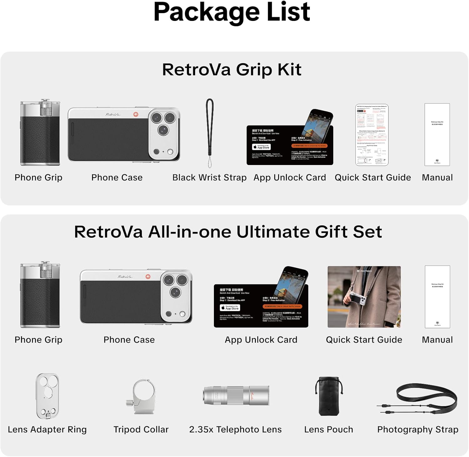 | BuiltIn Media | 2.35x Telephoto Lens *1, Phone Case(silver black for iPhone17 Pro Max)*1, Phone Grip*1, Photography Strap*1, Tripod Collar*1; Lens Pouch*1; Lens Adapter Ring for iPhone 17 Pro*1 |