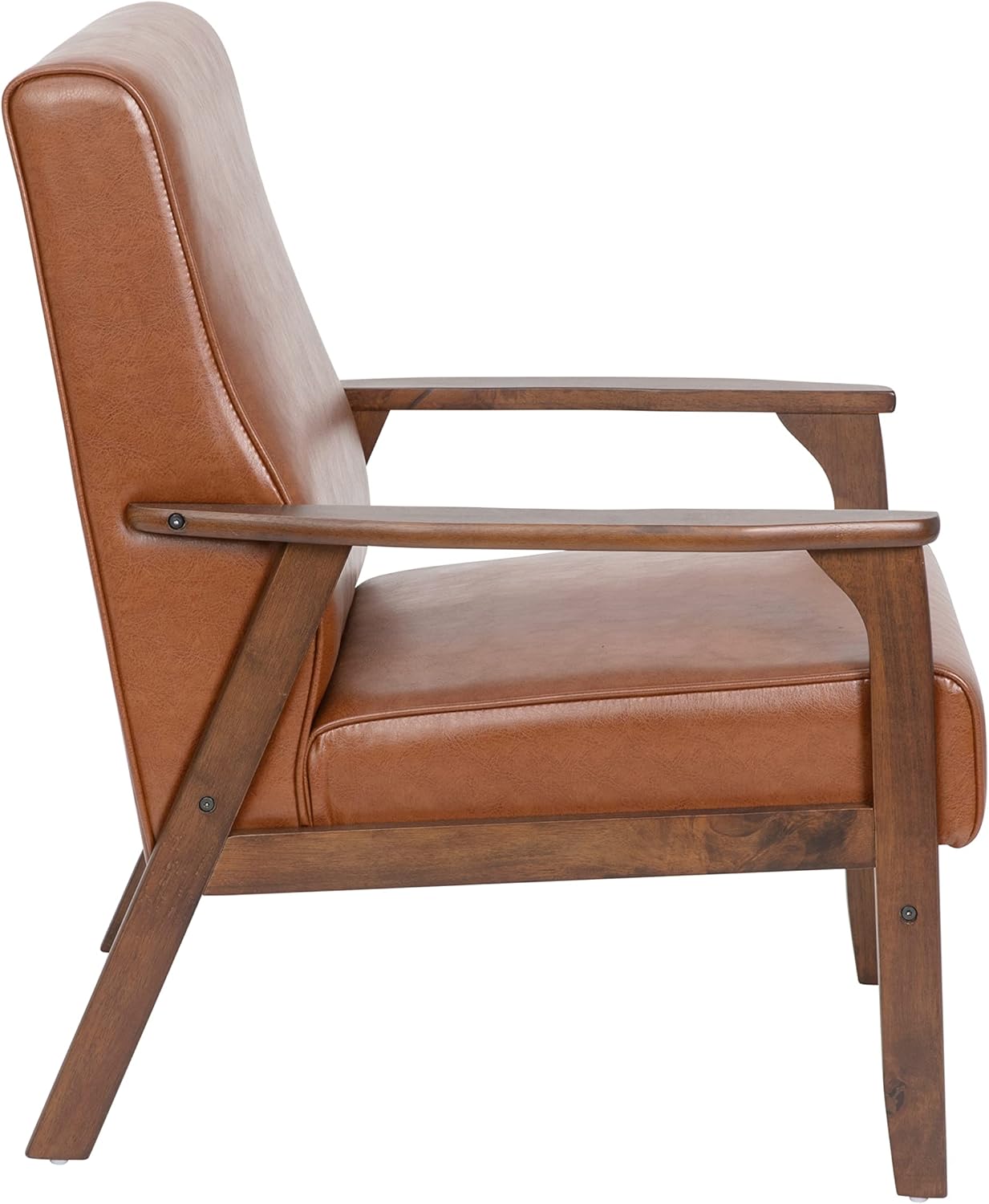 Modern, 21st century materials pair with timeless elegance in this mid-century modern armchair. The sturdy wooden frame and armrests feature a beautiful and elegant walnut finish, complemented by soft and durable faux leather upholstery. The solid wood legs are fitted with plastic floor glides to help prevent damage to hard flooring surfaces. Thoughtfully crafted with longevity in mind, the timeless sophistication of this armchair makes it the perfect addition to any home.